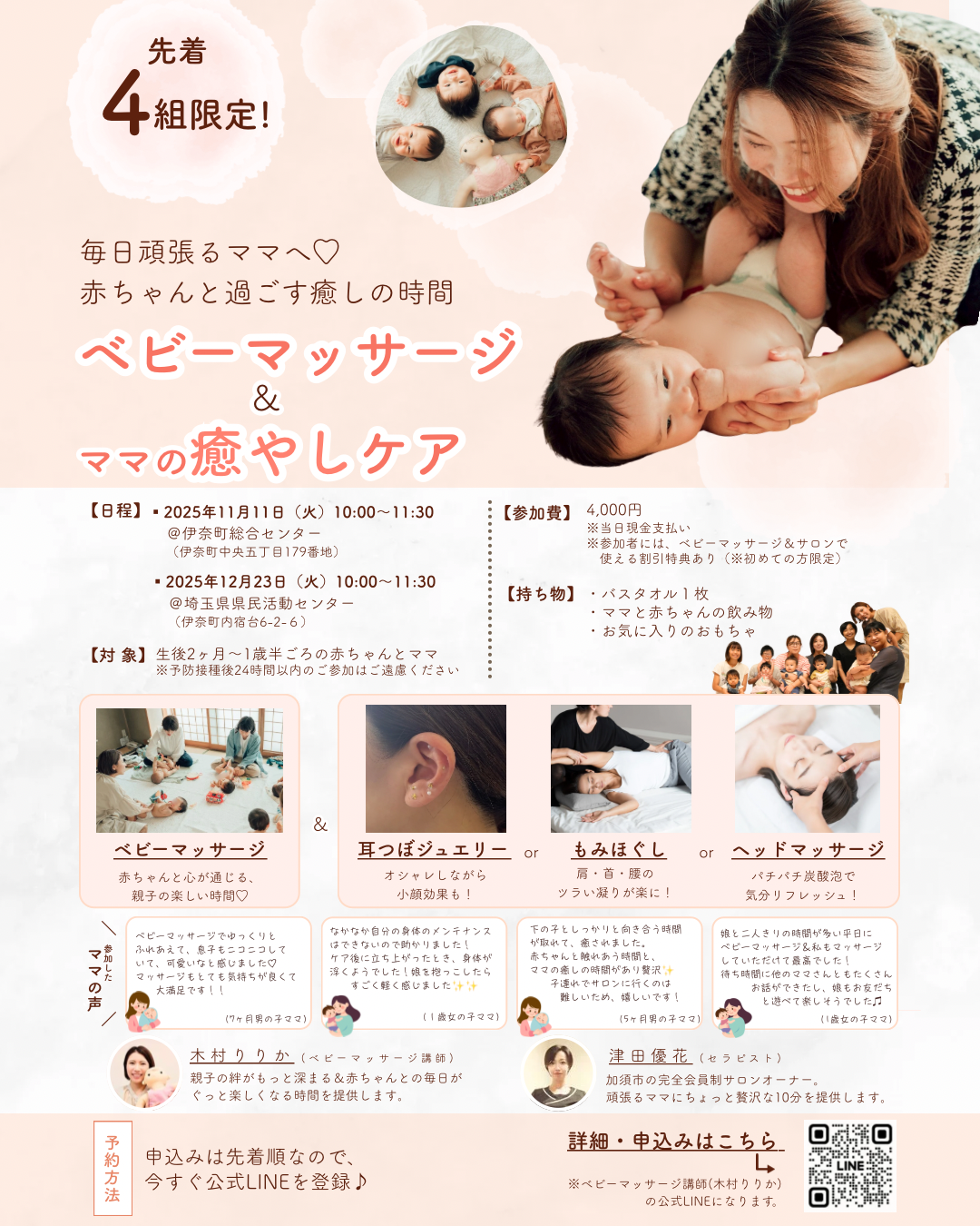 ✨ベビーマッサージ × 耳ツボ・もみほぐし コラボ開催✨ 11/11(火)に、 埼玉県 伊奈町総合センター にて ベビーマッサージとのコラボイベントを開催します👶🧡 ⏰ 10:00〜11:30 ありがたいことに、 残り2枠 となっております❣️ 赤ちゃんとのふれあい時間を楽しみながら、 ママ自身もリフレッシュできる特別な時間です😌✨ 参加ご希望の方は、 お気軽にメッセージください🌿🫧